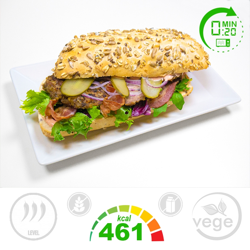 Składniki: Bułka pszenna z ziarnami 44,3% (mąka PSZENNA, zakwas PSZENNY, sól, gluten PSZENNY, ekstrakt słodowy, błonnik roślinny, słód PSZENNY, drożdże, olej, ziarna SOI, ziarna słonecznika, pestki dyni, siemię lniane, płatki OWSIANE), karkówka 18,6% (karkówka wieprzowa, sos BBQ, olej rzepakowy, musztarda (GORCZYCA), sos sojowy jasny (SOJA), pieprz czarny, sól), dip sriracha 18,6% (jogurt grecki (MLEKO), sos sriracha, majonez domowy (olej rzepakowy, pasteryzowane żółtka JAJ, musztarda (GORCZYCA)), sok z limonki (zawiera SIARCZYNY), czosnek, pieprz czarny, sól morska), ogórek 11,1%, mix sałat 7,4% (endywia escarola, endywia frisée, cykoria radicchio, rukola).